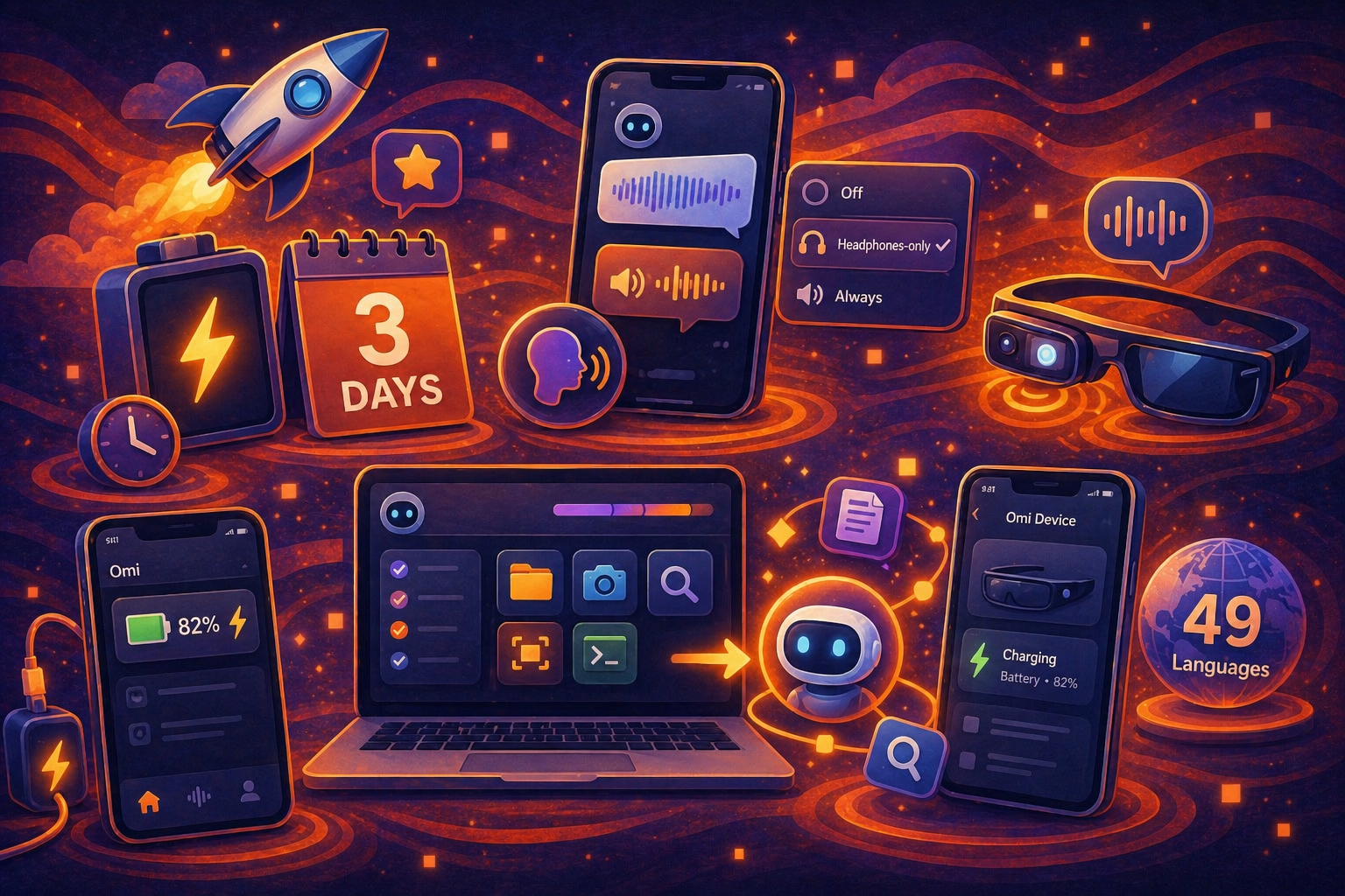 Omi devices now last up to 3 days on a single charge with the latest firmware. Update from device settings to opt in. A confirmation dialog walks you through what's changing before the flash starts.